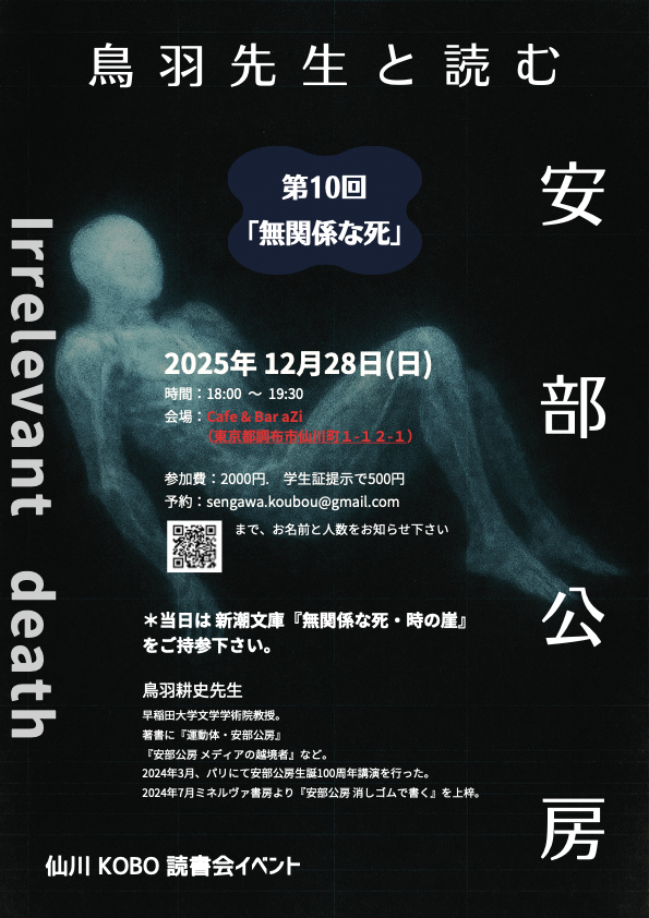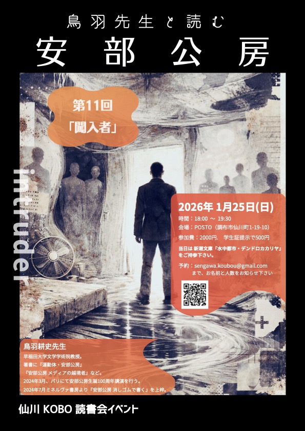 早稲田大学・鳥羽耕史教授にご協力いただき、2023年11月から毎月、読書会「鳥羽先生と読む安部公房」を開催しています。仙川で安部の作品を読み、語り合う場は、作家の息づかいを現在に伝える大切な時間になっています。